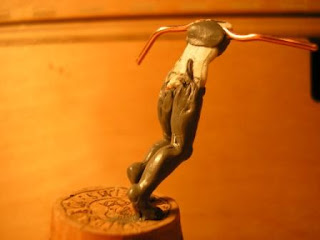 After posing the wire I started to build from the bottom up trying to get the legs and feet into proportion then worked up the body to the arms and hands. The heads are to be separate so will be modelled separately to give maximum variety.
